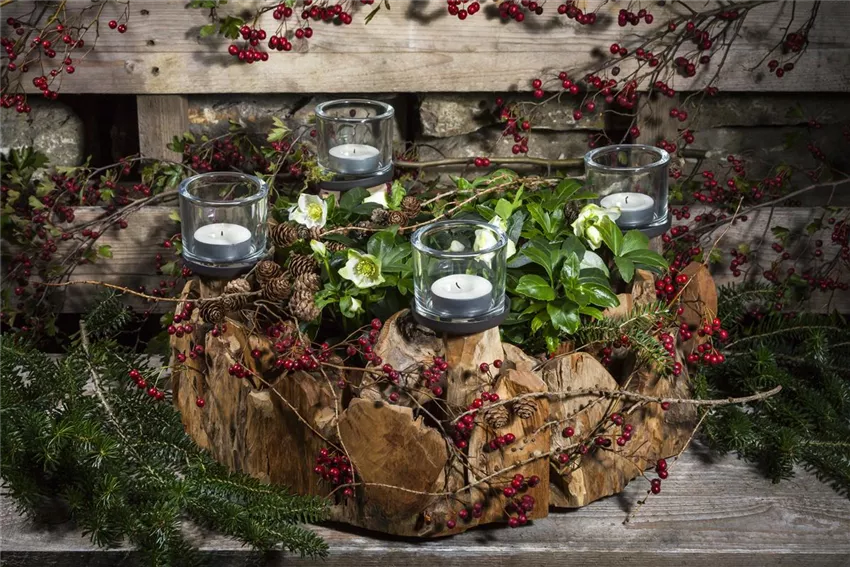 Alles schön und gut, mag mancher Blumenliebhaber nun denken, aber gibt es denn auch einen Adventskranz mit richtigen Blüten? Oh ja! Stellen Sie vier Kerzen in die Mitte einer Kork- oder Holzplatte und umringen Sie sie mit dem getrockneten Flor der fantastischen Hortensie. Dazu folgender Tipp: Kappen Sie die Stängel mehrere Zentimeter unterhalb der Blüte schräg ab und entfernen Sie die Blätter. Dann geben Sie sie in ein Gemisch aus einem Teil Glyzerin und drei Teilen Wasser. Nun lassen Sie das Wasser verdunsten. Automatisch geht dann das Glyzerin in die Blütenpracht über und konserviert sie. Die Farbenpracht bleibt erhalten! Falls Sie diese effektvolle Pflanze noch nicht in Ihrem Garten haben – das können Sie ja nachholen.