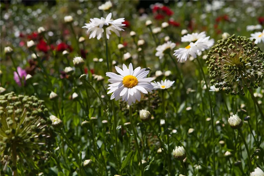 Natürlich gibt es auch den pflegeleichten Garten nicht ohne Stauden. Sie bringen Leben ins Beet. Für wenig Aufwand greift man zu einigen ausgewählten Sorten und pflanzt jeweils mindestens drei Individuen. Unterschiedliche Höhen beachten und gute Farbkombinationen wählen und schon kann der Sommer auch für den Hobbygärtner mit begrenzter Freizeit kommen. Robuste Pflanzen sind gefragt. Allen voran Frauenmantel und Wolfsmilch. Für den Frühling empfehlen sich dann das dicht wachsende Blaukissen, die hohen Lupinen, der farbenprächtige Nelkenwurz und viele attraktive Lilienarten; für den Sommer die rustikale Stockrose, die exotische Gladiole, das zarte Schleierkraut und die strahlende Sonnenbraut. Zum Schluss all die wunderschönen Dahlien und Astern, die den Herbst einläuten.