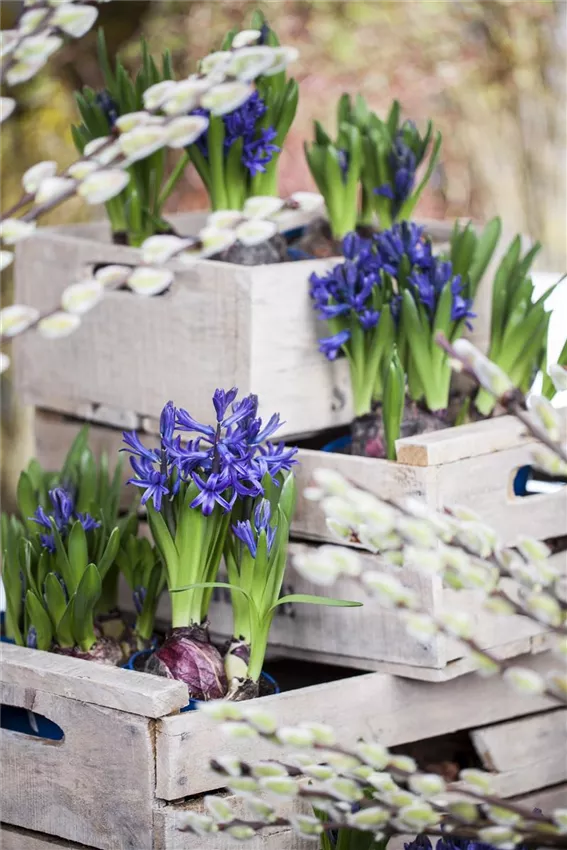 Je nach Pflanzenart brauchen die Zwiebeln 4 bis 6 Wochen bis sie im Haus blühen. Schon beim Antreiben können Sie darauf achten, schöne Blumenkombinationen zu pflanzen. Eine harmonische Farbzusammenstellung macht viel aus. Die Blüte hält etwa ein bis zwei Wochen an. Ihre Lebensdauer richtet sich nach der Zimmertemperatur. Je wärmer es ist, desto schneller entwickeln sich die Blumen und verblühen. Mehr als 20 °C sollten nicht herrschen. Selbst wenn Kälte die Lebensdauer fördert: Frost vertragen die Frühblüher nicht. Deshalb werden sie auch erst nach dem letzten Frost ausgepflanzt, sofern Sie die Pflanzen im nächsten Jahr im Garten wieder blühen sehen wollen.
