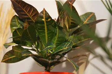 Große Blätter im dunklen Grün mit interessantem Muster in Orange: Der Wunderstrauch ist aus guten Gründen eine beliebte Zimmerpflanze fürs gemütliche Heim.